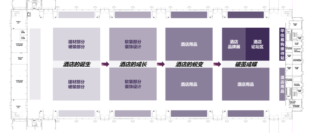 Hotel&Shop Plus為華住E4館策劃了以“破繭成蝶”為主題:與春同行,蝴蝶的翅膀是季節的聲明,也是一年的念想,從結繭包裹的孕育,到破繭振翅的紛飛,在迷途未遠之時,遁蝴蝶之蹤可抵春天…… 設置“酒店業全生命周期”的專題館,囊括從酒店的誕生、成長、蛻變到破繭成蝶的完整產業鏈